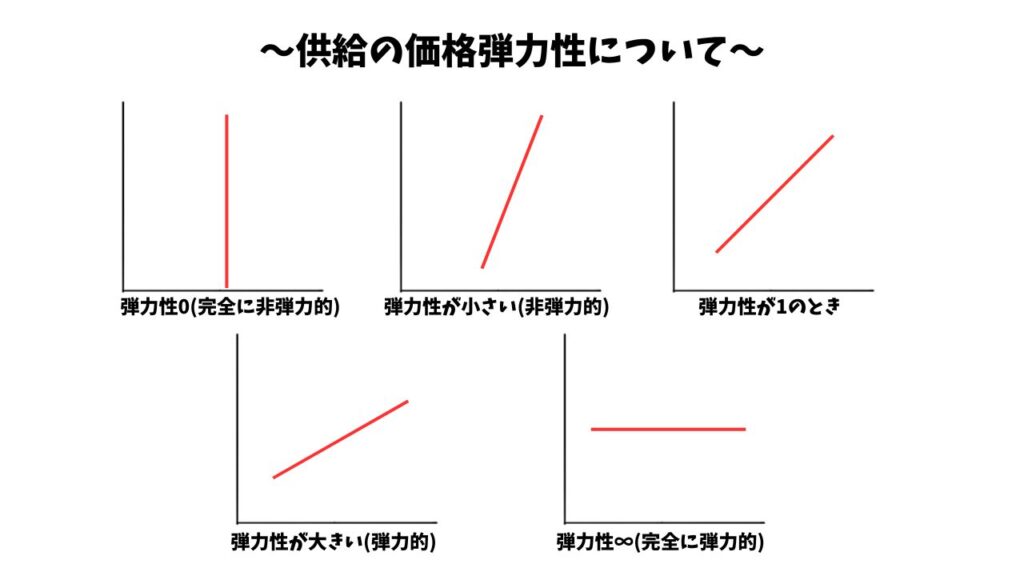 一般的に、弾力性が1よりも大きいとき供給は弾力的、弾力性が1より小さいとき供給は非弾力的になります。
