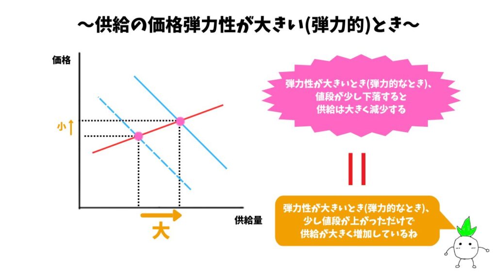 弾力性が大きい場合、供給曲線の傾きはなだらかになります。
