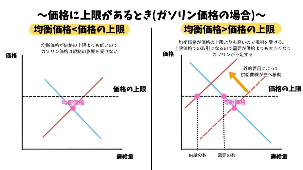 反対に、均衡価格の方が価格の上限よりも高い場合(均衡価格>価格上限)、ガソリンは上限の価格で取引されるようになるので、ガソリンが不足してしまいます。