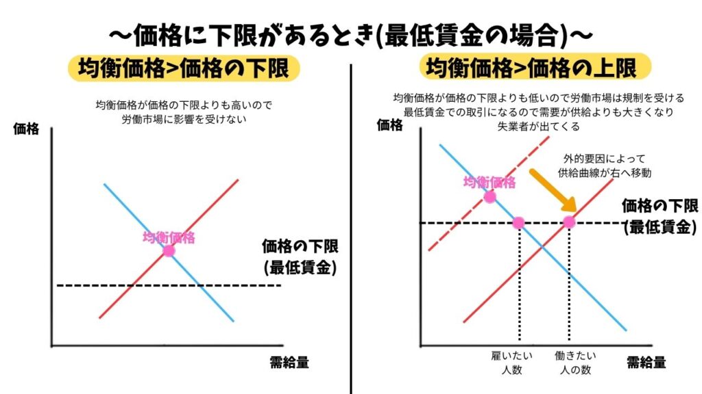 反対に、最低賃金が均衡水準よりも高くなる場合(均衡価格<価格下限)、労働の供給量が需要量を上回るので失業が生じてしまいます。
