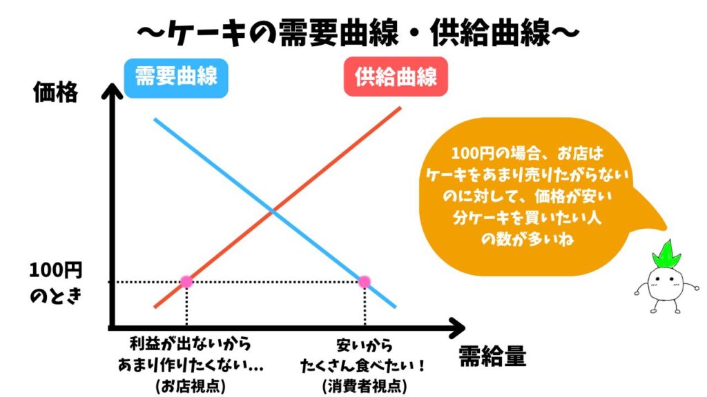 その結果、お菓子屋さんはお客さんに買ってもらえる価格までケーキの値段を下げます。