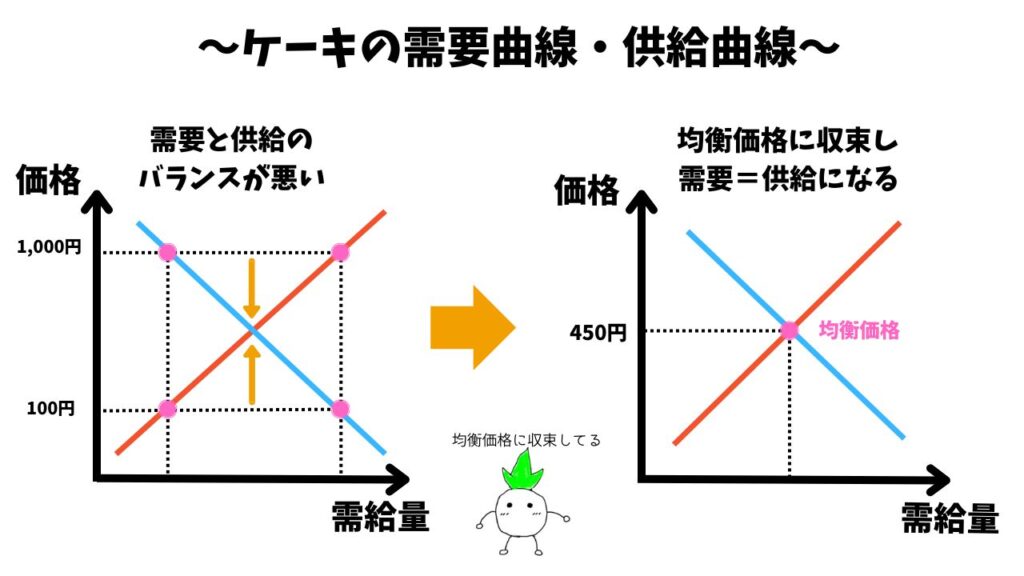 今回は需要曲線と供給曲線が交わっている均衡点が450円なので、ケーキの価格は450円で安定します。