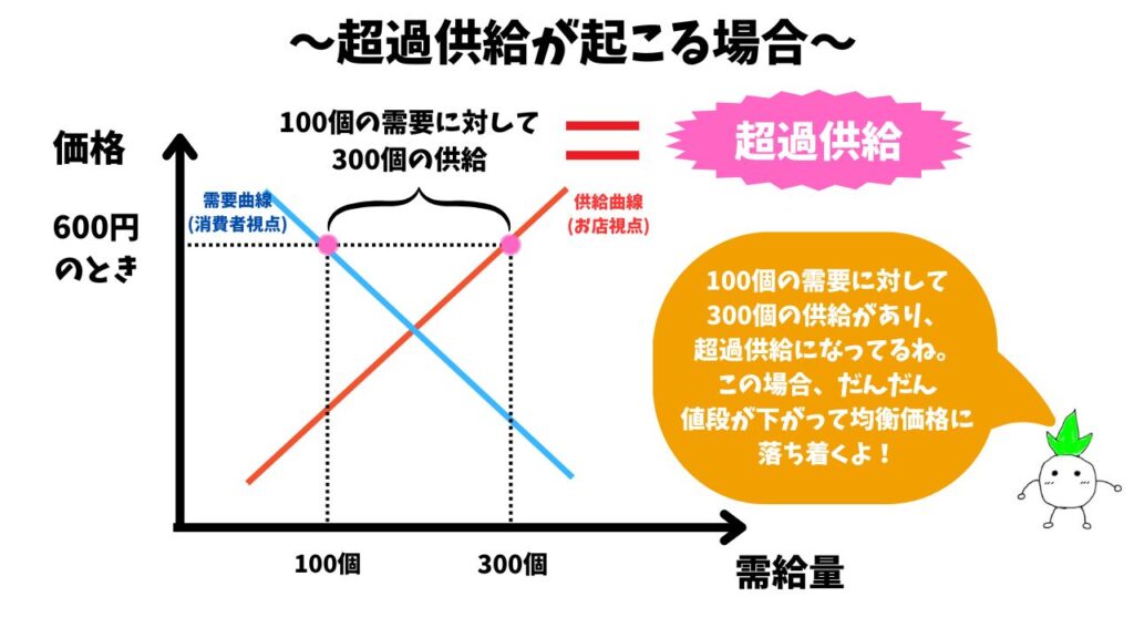 このように「需要<供給」となっている状況を「超過供給」といいます。