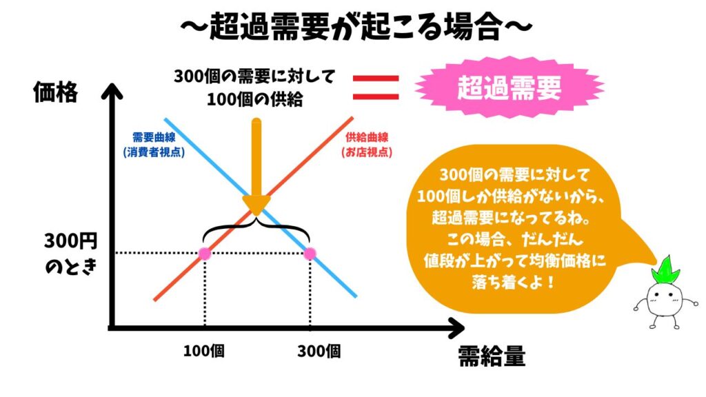 反対に、お菓子屋さんがケーキ1個を300円で販売した場合、ケーキの供給量に対して「ケーキを買いたい」というお客さんの数が多くなります。(需要>供給)
