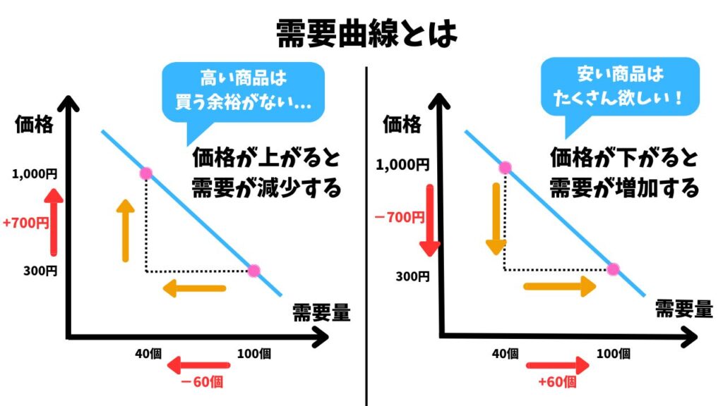 グラフのように、価格が高くなると需要が減少し、価格が低くなると需要が増加します。