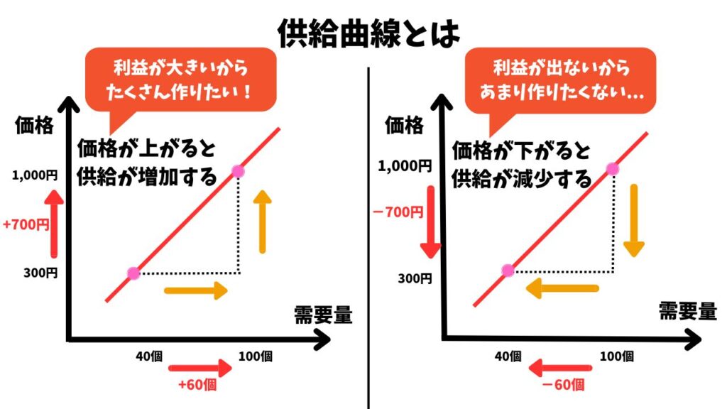 - 供給曲線・・・「価格が上がるほど作りたい量が増える」という企業側の行動