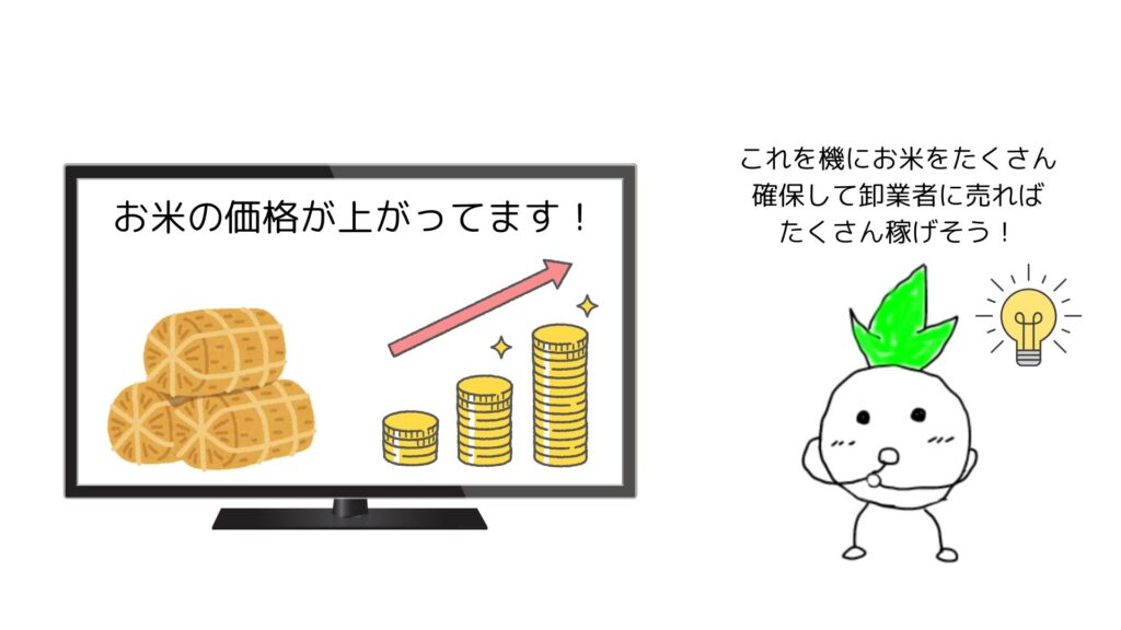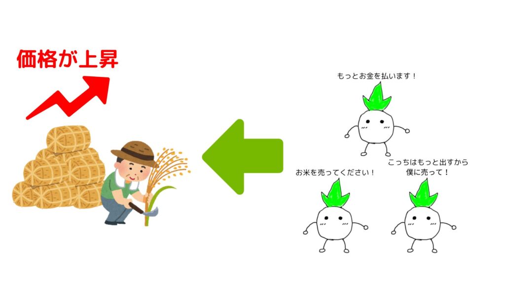 ある業者が値段を上げてお米を確保しようとすると、他の業者もお米を確保するためにその価格よりも高い金額を出さなければならなくなります。