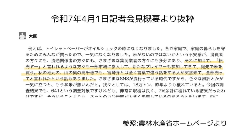 実際に、江藤前農林水産大臣は、令和7年4月1日の記者会見で「転売ヤーといわれるような方々も一部市場に参入してきている」と述べています。