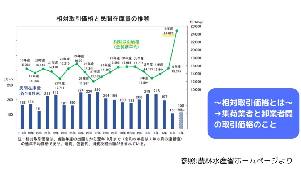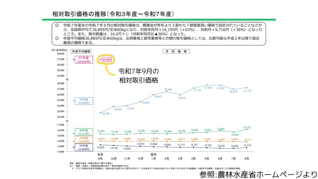 データを見てみると、集荷業者と卸業者の間の取引価格を示す相対取引価格は、令和5年産までは11,000円~16,000円あたりを推移していましたが、令和6年産の平均価格は24,825円、令和7年産の9月の価格は36,895円と急激に価格が上昇していることが分かりますね。