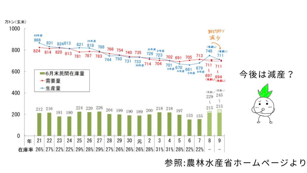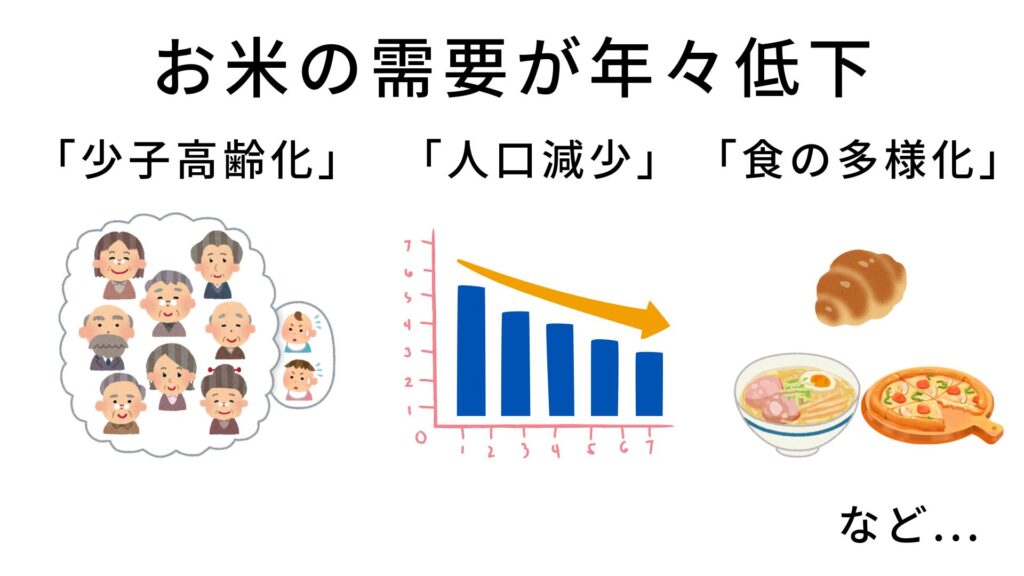 近年、「少子高齢化」「人口減少」「食の多様化」などの要因により、日本のお米の需要は年々下がり続けており、政府は需要の減少に合わせてお米の生産量を減らすように調整していました。