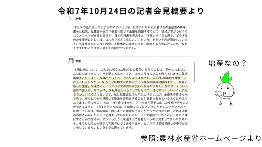 2025年10月24日の記者会見で、鈴木農林水産大臣は「まず2030年の生産量、これを791万トンから818万トンに増大をさせるという基本計画の目標の下で、「需要に応じた生産」を進めるというこれまでの方針に変わりはありません。」と述べています。(農林水産省HPより)