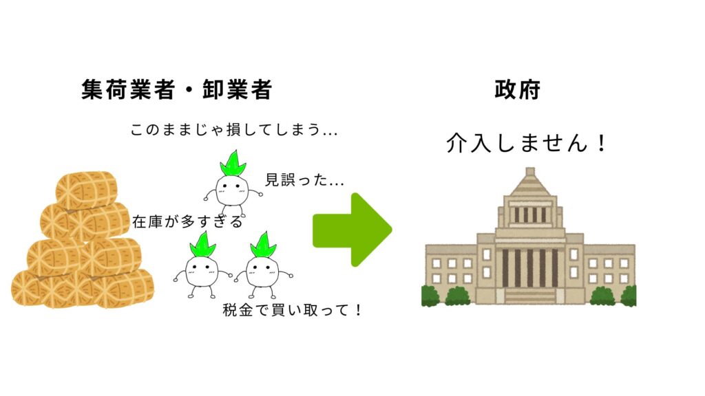 このように思ってしまいますが、税金を投入してお米自体の価格を下げるということは、価格競争で価格を引き上げてしまった集荷業者のミスを国が補填することになります。