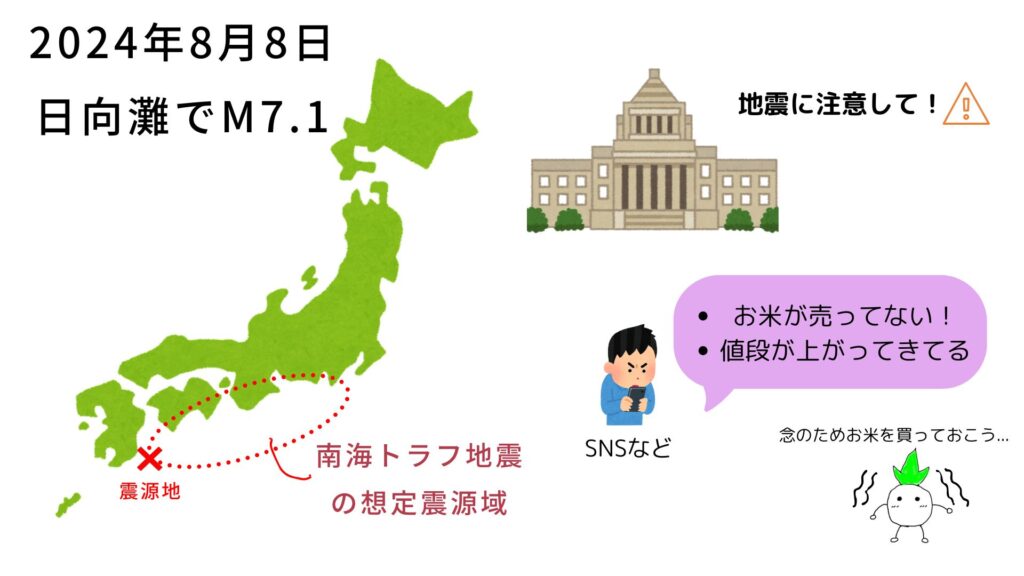 今回発生した令和の米騒動は、2024年の夏に発生した日向灘沖地震によって初めて南海トラフ地震臨時情報が発表されたことがきっかけです。