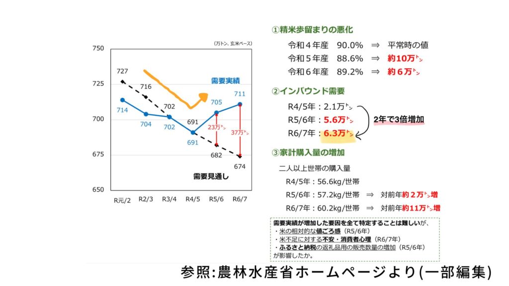 この精米歩留まりの悪化の影響もあって、ここ2年ほどは収穫量に対して精米の量が少なかったので、お米の供給量も少なくなっていました。
