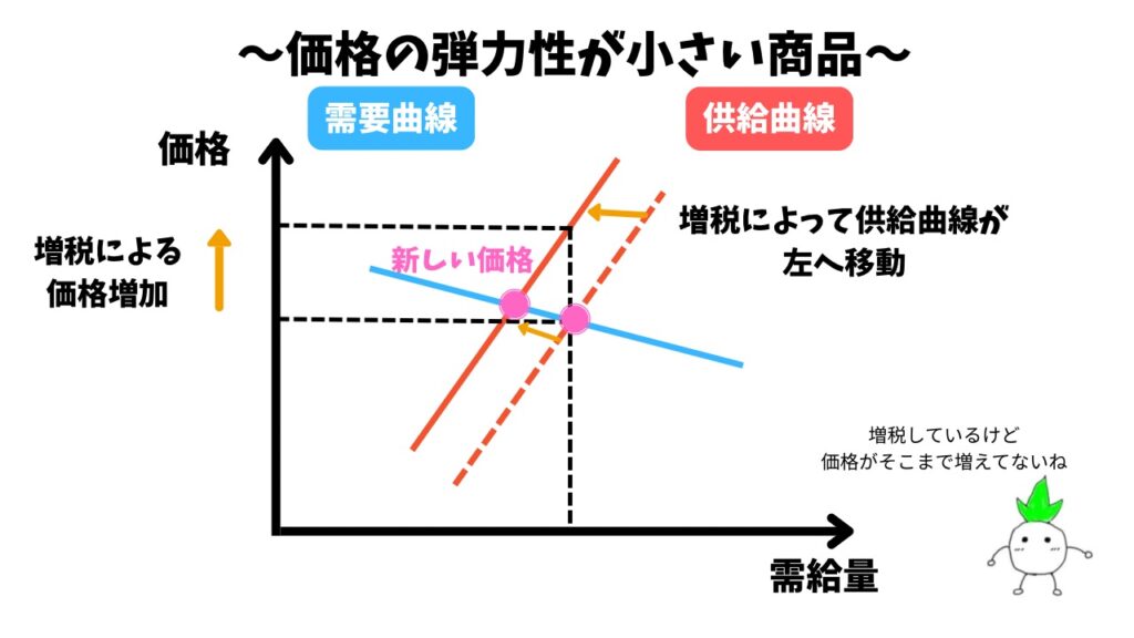 弾力性が小さい商品はお客側の負担が少なくお店側の負担が大きいので、消費税が0%になっても価格がそこまで下がりません。また、お店側が売上のために多少値を下げていた場合(税込で500円以下になるように調整するなど)、消費税がなくなることで値上げ(正規価格へ戻す)が行われる可能性があります。