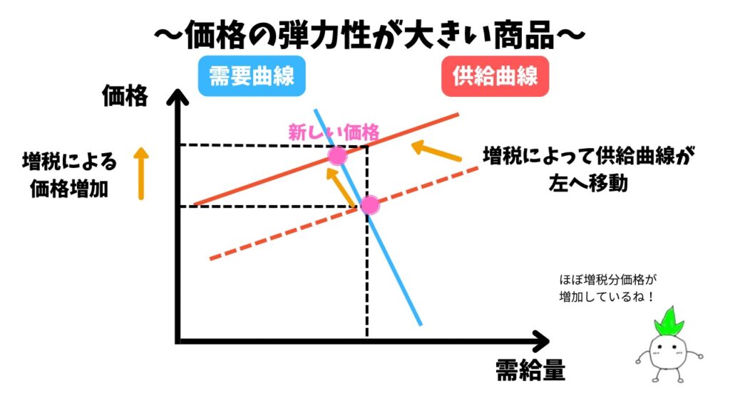 一方、弾力性が大きいもの(贅沢品)は、消費税によって価格が上昇しても消費が落ち込むことはないので、お客側が消費税の大部分を負担しています。
