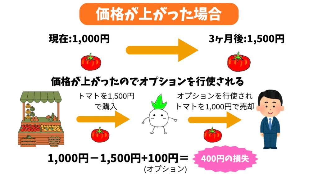 取引時にトマトの価格が1,500円に上昇した場合、カブ君はオプションを行使して400円(1,500円(取引時の時価)ー1,000円(取引価格)ー100円)の利益が出ます。
