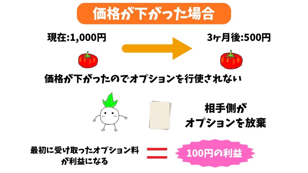 市場価格は500円に下落した場合、買い手は1,000円で買うと損をするのでオプションを放棄し、売り手はトマトを売らずに済みます。