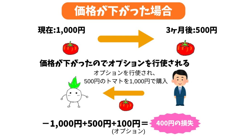 もしトマトが500円に下落した場合、市場価格が500円のトマトを1,000円で売ることができるのでオプションを行使して400円の利益が出ます。